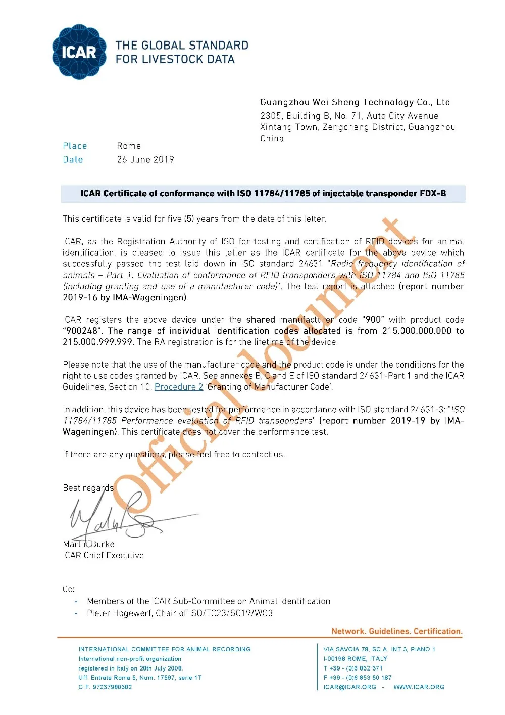The default number range of this product is 15 digital ICAR number (e.g : 900215000000001). Other 15 digital numbers also can be encoding on your request. (please mark the chip number when ordering)