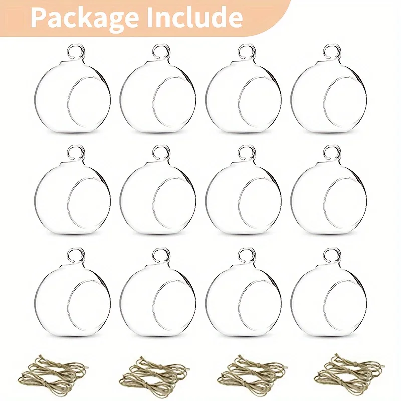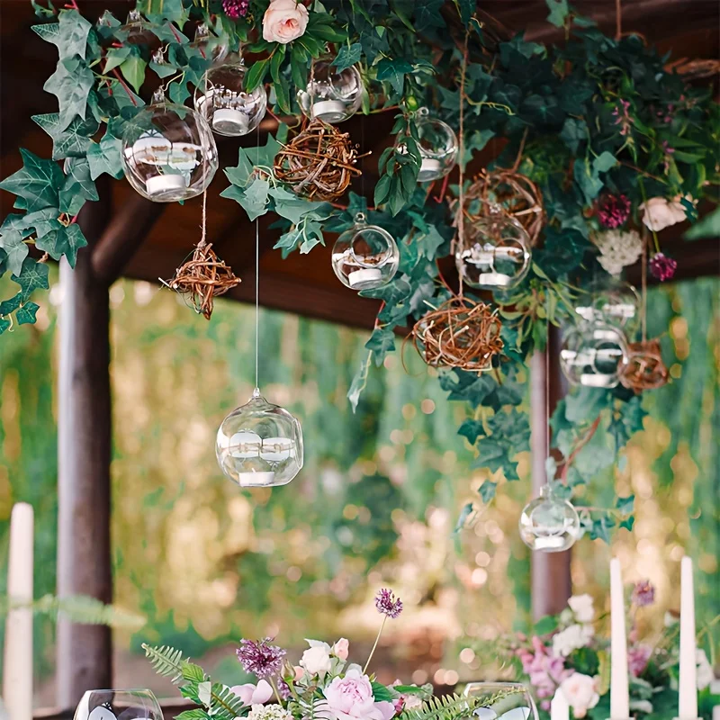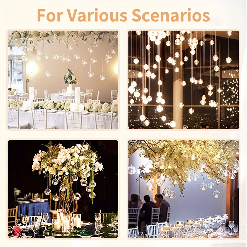 This set includes 100 pieces of 3.15-inch (8 cm) hanging glass globes designed as versatile holders for tea lamps, air plants, or small decorative items. Crafted for both indoor and outdoor use, these transparent spheres enhance home or garden aesthetics by creating elegant displays. Their durable glass construction and convenient hanging design make them ideal for terraces, patios, or any space needing a stylish, functional accent.