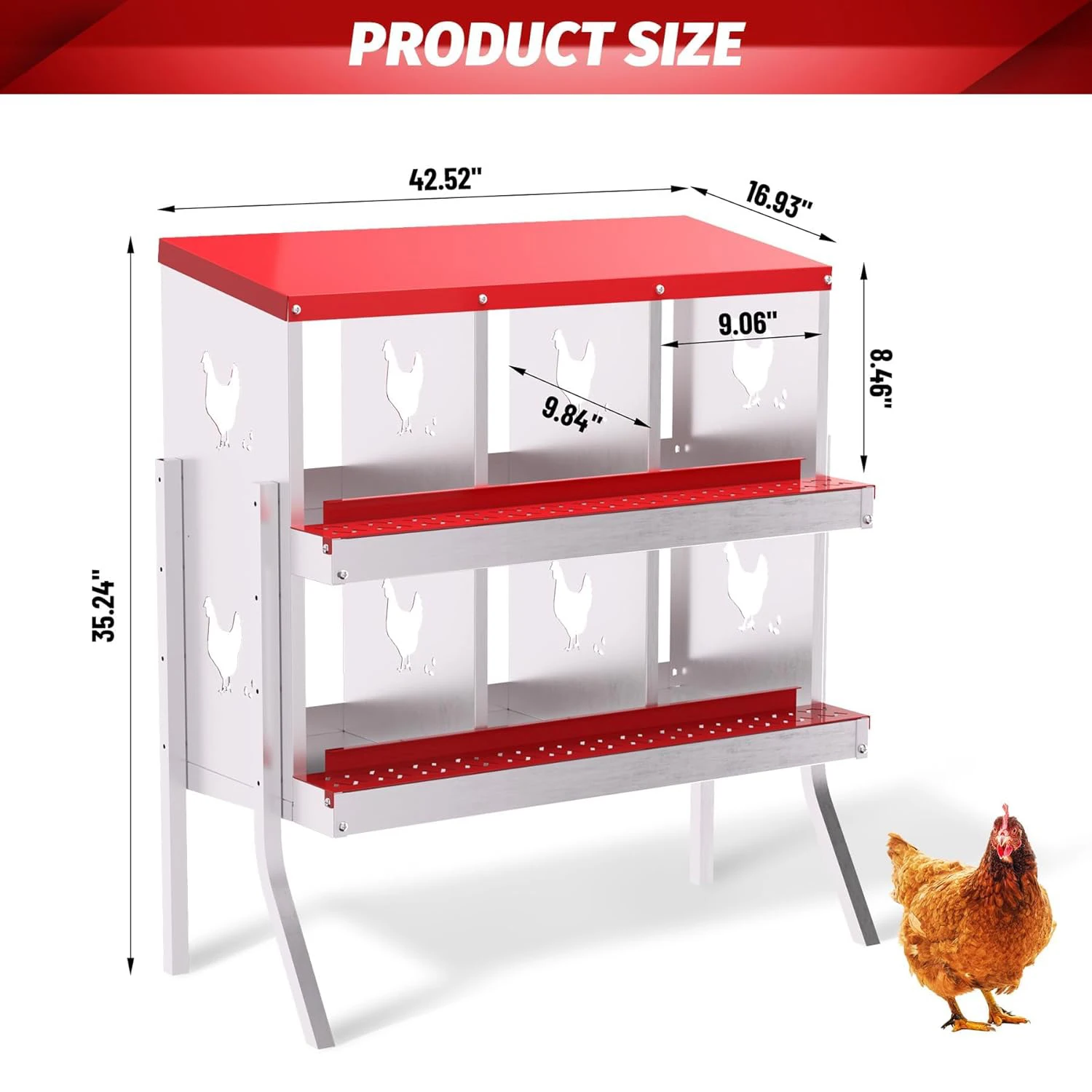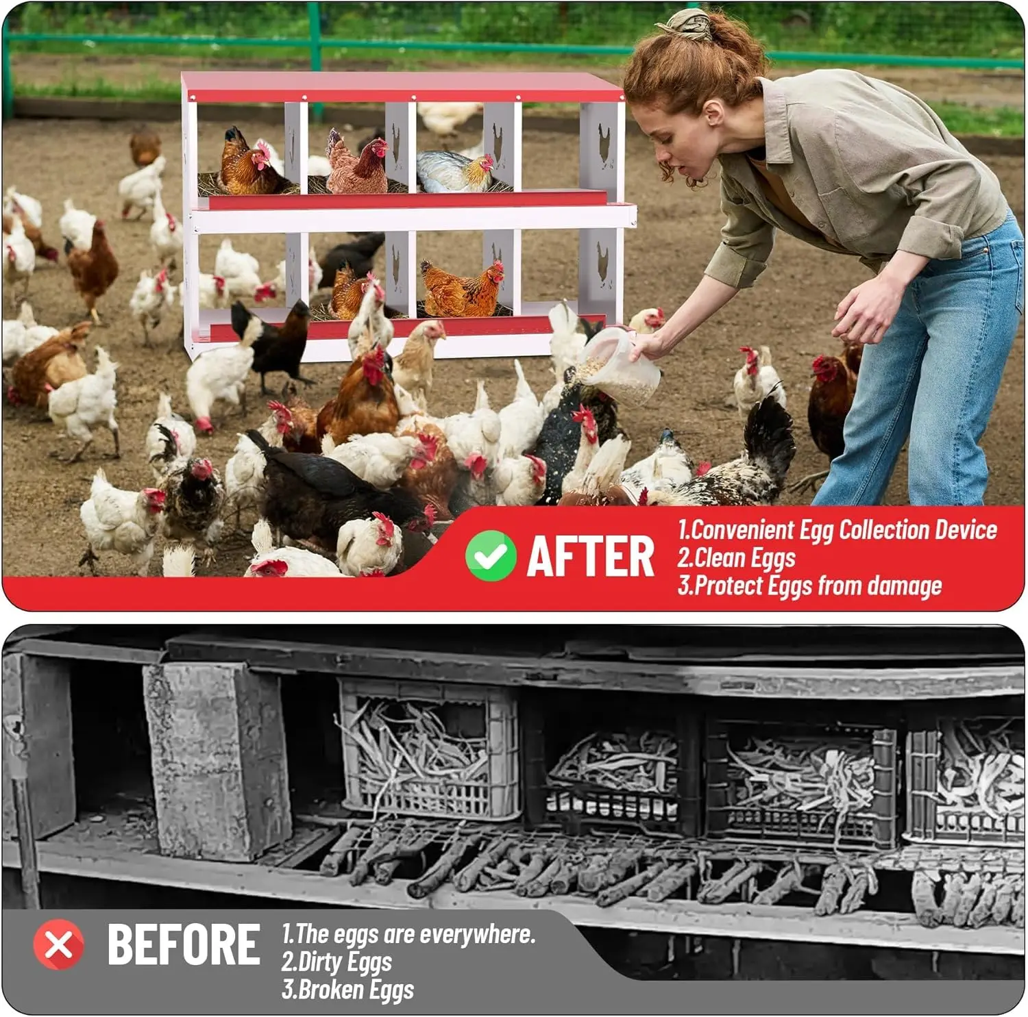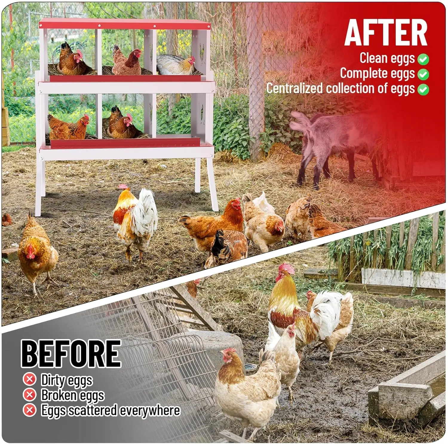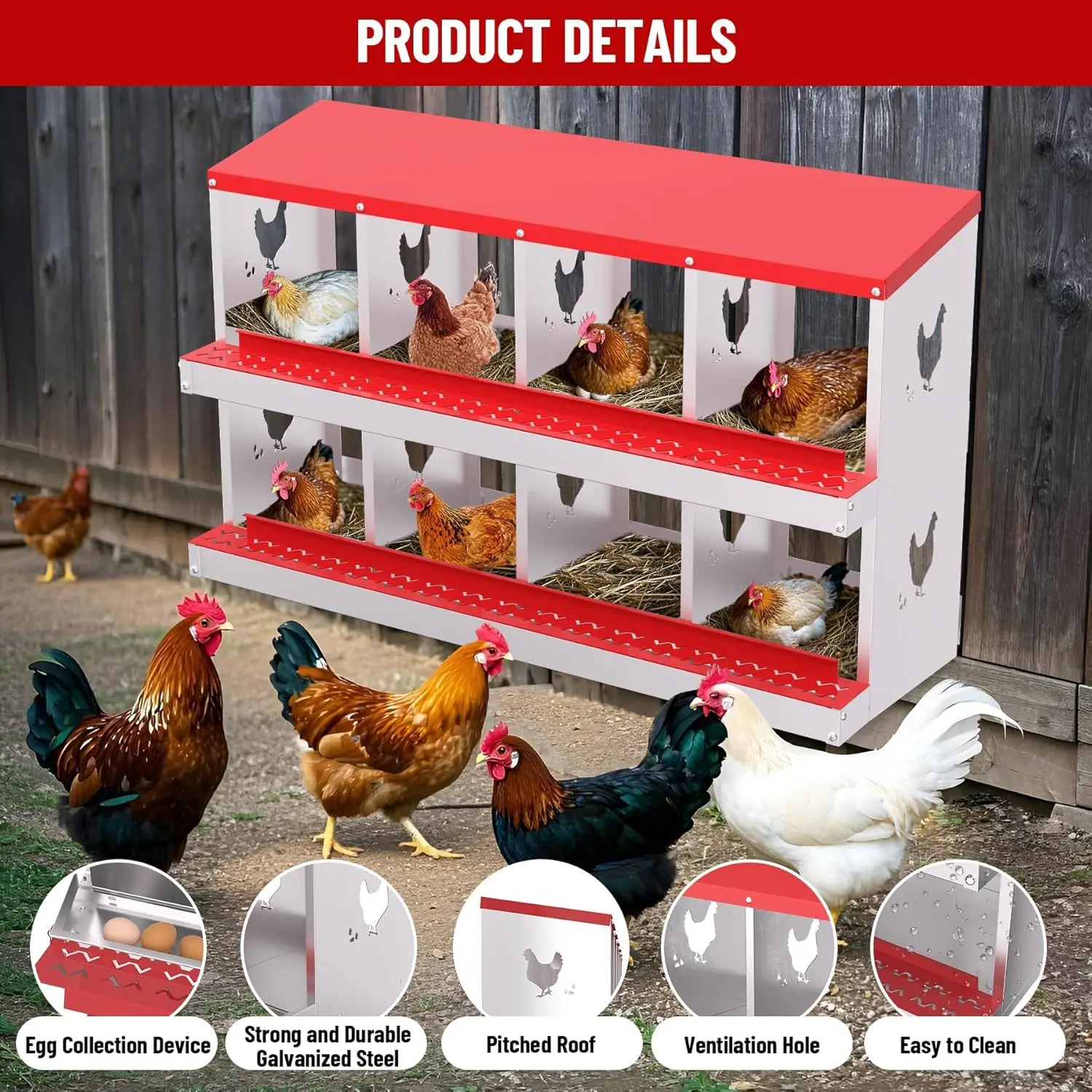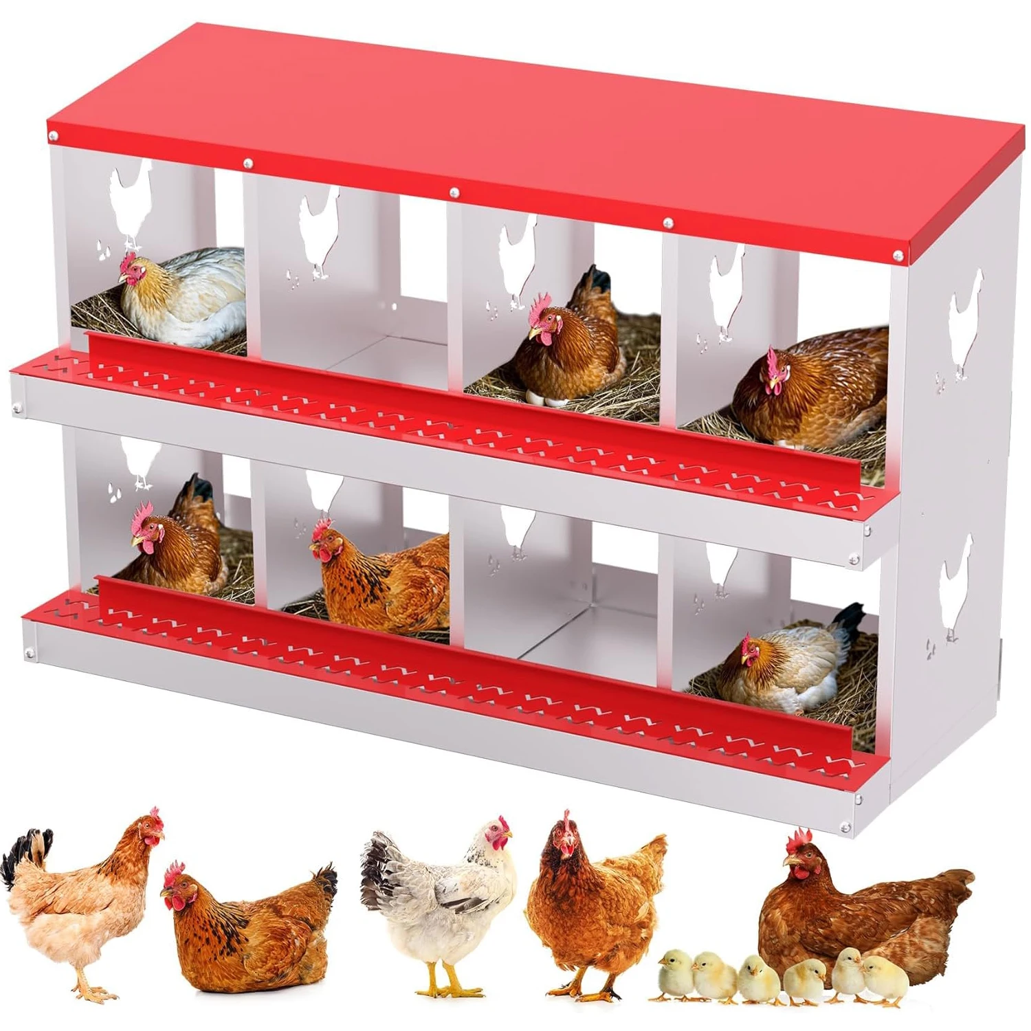 Durable All-Metal Construction: Say goodbye to fragile plastic parts with our heavy-duty galvanized steel construction. Our metal nesting boxes are built to last, ensuring long-term stability and reliability. Designed to Improve Egg Production: Our egg laying boxes can be mounted on the wall to encourage hens to lay eggs in a safe and secure environment, preventing them from destroying the eggs. Each egg laying box has three compartments, providing ample space for larger hens, ultimately increasing egg production. Enhanced Ventilation and Aesthetic Design: Our egg laying boxes have chicken-shaped perforations on the sides, which not only improve ventilation but also increase aesthetics. Provide a safe and comfortable environment for your flock. Easy Maintenance and Cleaning: Simply rinse with a garden hose to keep it clean and provide a hygienic egg-laying environment for your hens. Our metal egg laying boxes come with screws that align perfectly with the pre-installed holes, ensuring easy assembly. Coupled with the simple and intuitive instruction manual, it only takes an adult 20 minutes to have the egg laying box fully assembled and ready to use. Easy Access and Maintenance: Our hen boxes come with hinged lids for quick and easy access to eggs. Removable dividers and nest mats make cleaning and maintenance a breeze, ensuring optimal hygiene for your flock