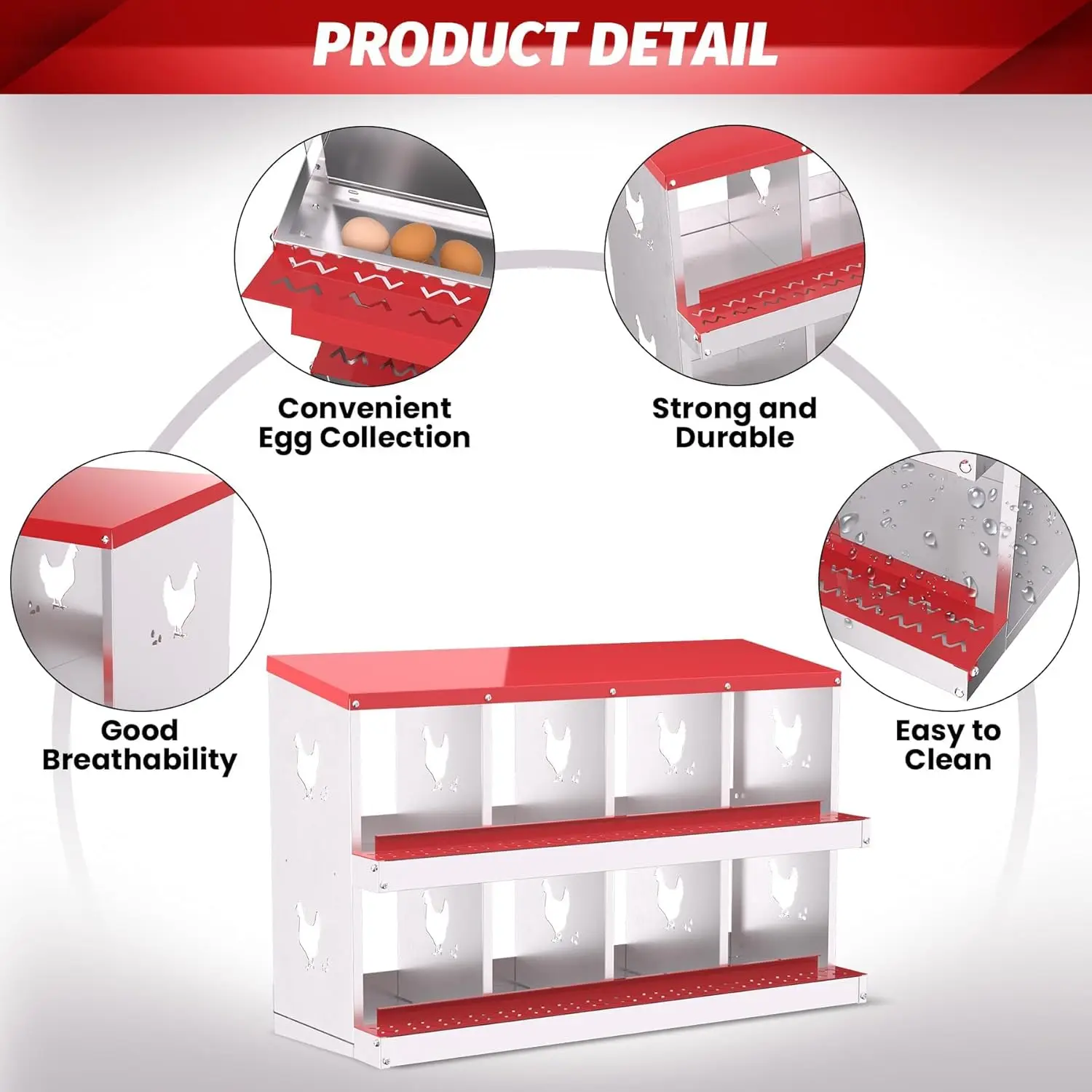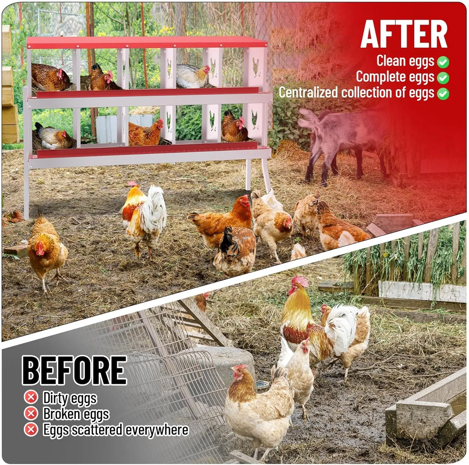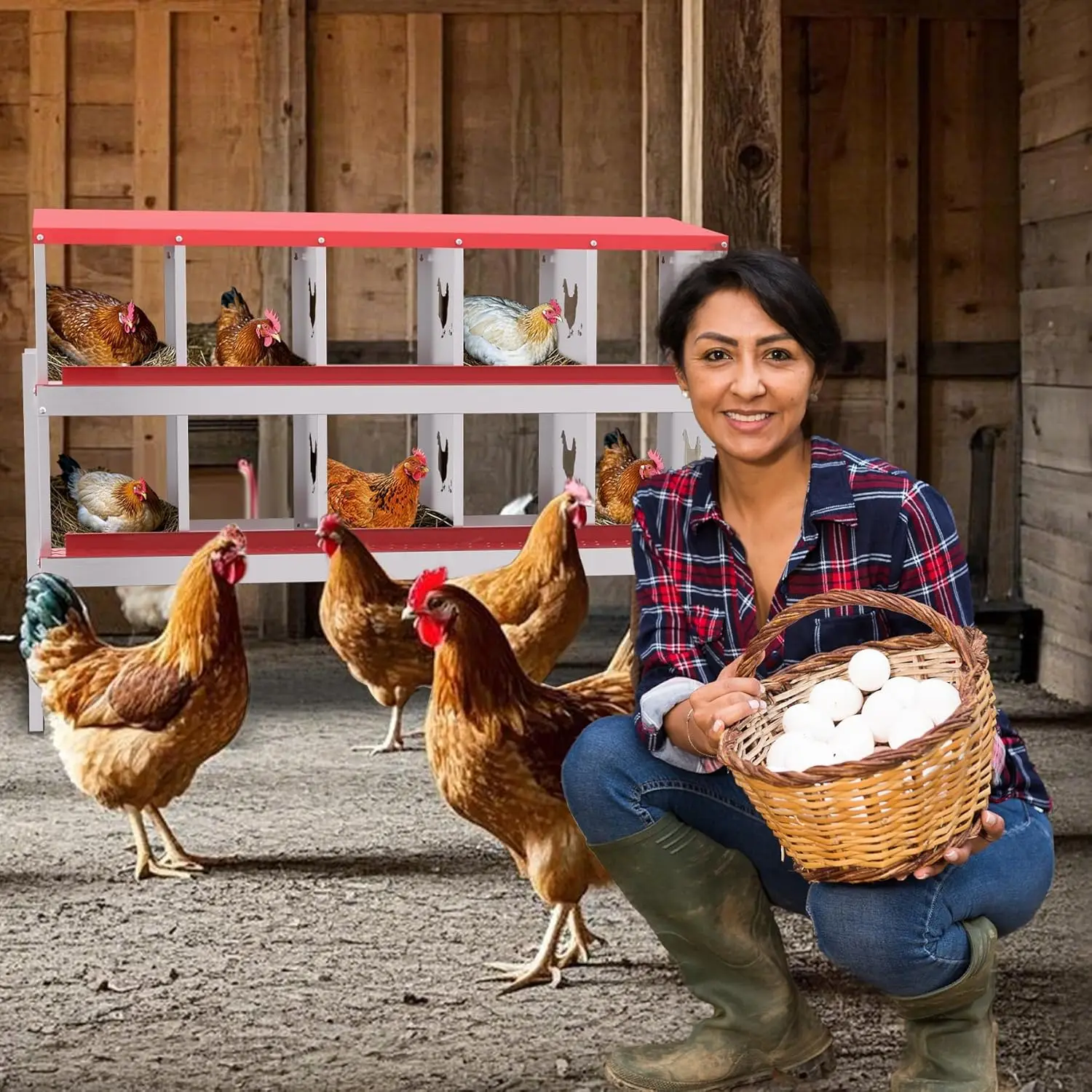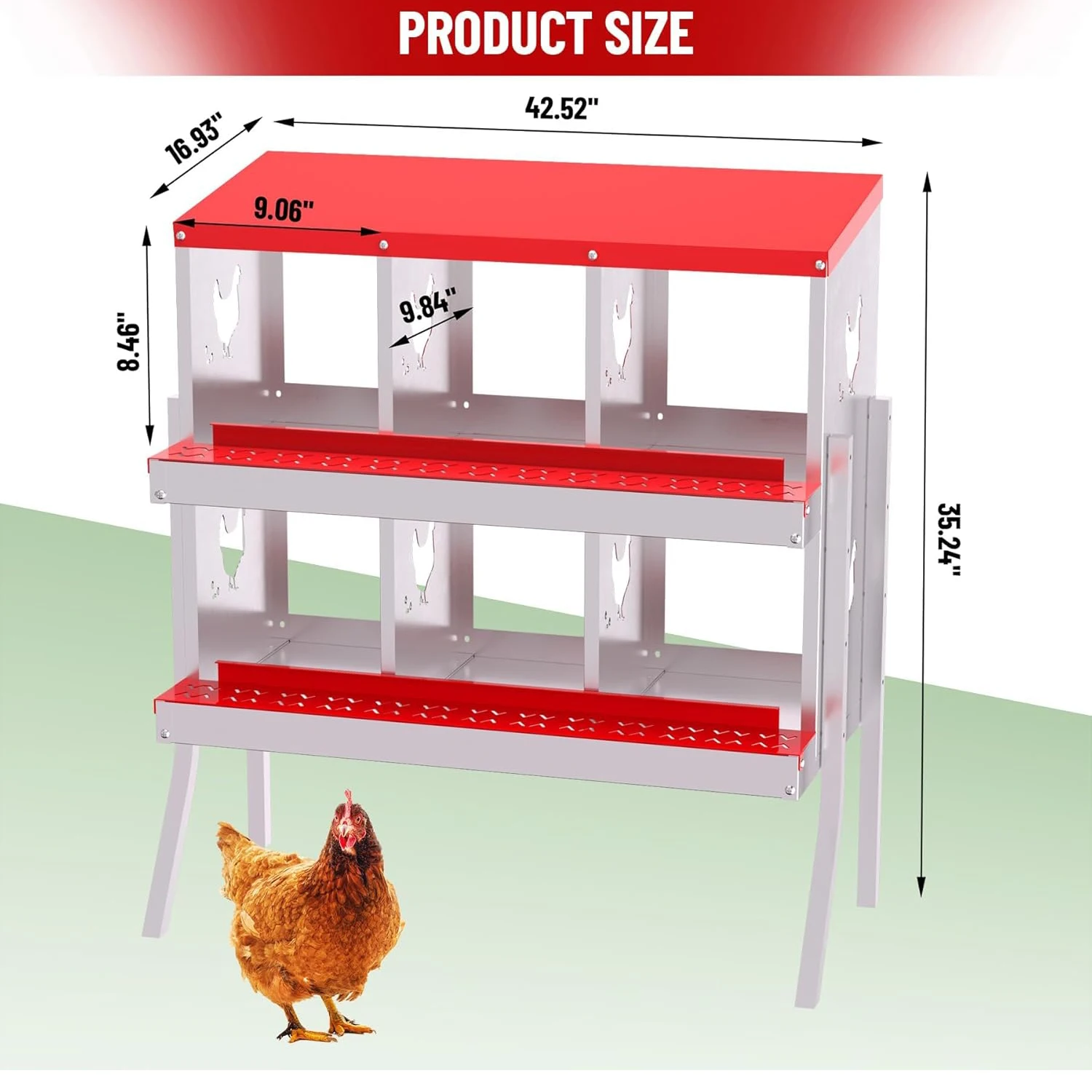 Durable All-Metal Construction: Say goodbye to fragile plastic parts with our heavy-duty galvanized steel construction. Our metal nesting boxes are built to last, ensuring long-term stability and reliability. Designed to Improve Egg Production: Our egg laying boxes can be mounted on the wall to encourage hens to lay eggs in a safe and secure environment, preventing them from destroying the eggs. Each egg laying box has three compartments, providing ample space for larger hens, ultimately increasing egg production. Enhanced Ventilation and Aesthetic Design: Our egg laying boxes have chicken-shaped perforations on the sides, which not only improve ventilation but also increase aesthetics. Provide a safe and comfortable environment for your flock. Easy Maintenance and Cleaning: Simply rinse with a garden hose to keep it clean and provide a hygienic egg-laying environment for your hens. Our metal egg laying boxes come with screws that align perfectly with the pre-installed holes, ensuring easy assembly. Coupled with the simple and intuitive instruction manual, it only takes an adult 20 minutes to have the egg laying box fully assembled and ready to use. Easy Access and Maintenance: Our hen boxes come with hinged lids for quick and easy access to eggs. Removable dividers and nest mats make cleaning and maintenance a breeze, ensuring optimal hygiene for your flock