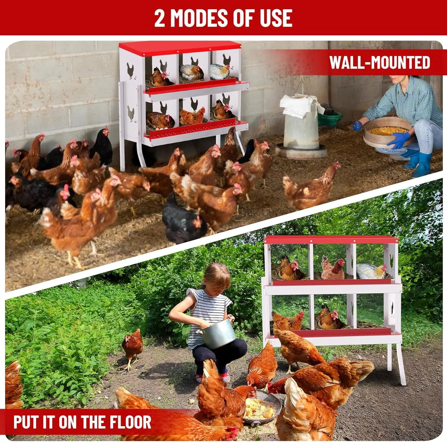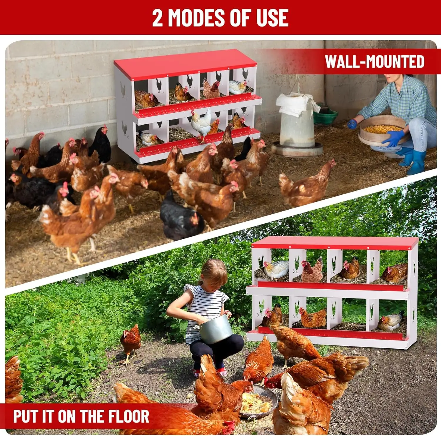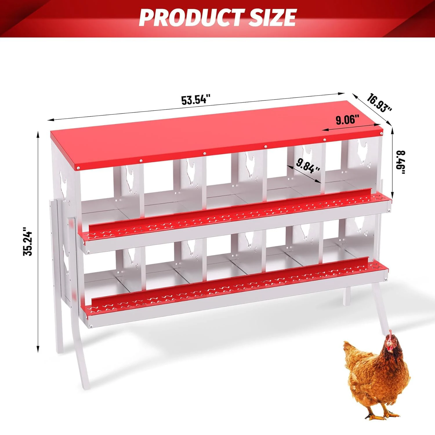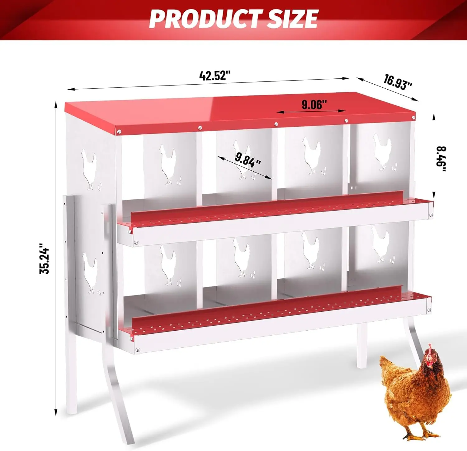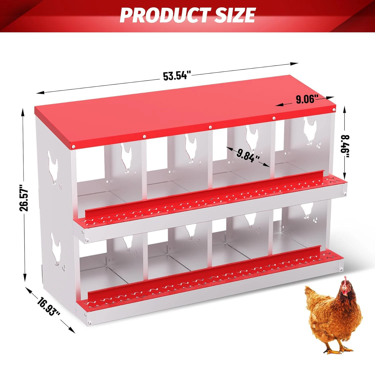 Durable All-Metal Construction: Say goodbye to fragile plastic parts with our heavy-duty galvanized steel construction. Our metal nesting boxes are built to last, ensuring long-term stability and reliability. Designed to Improve Egg Production: Our egg laying boxes can be mounted on the wall to encourage hens to lay eggs in a safe and secure environment, preventing them from destroying the eggs. Each egg laying box has three compartments, providing ample space for larger hens, ultimately increasing egg production. Enhanced Ventilation and Aesthetic Design: Our egg laying boxes have chicken-shaped perforations on the sides, which not only improve ventilation but also increase aesthetics. Provide a safe and comfortable environment for your flock. Easy Maintenance and Cleaning: Simply rinse with a garden hose to keep it clean and provide a hygienic egg-laying environment for your hens. Our metal egg laying boxes come with screws that align perfectly with the pre-installed holes, ensuring easy assembly. Coupled with the simple and intuitive instruction manual, it only takes an adult 20 minutes to have the egg laying box fully assembled and ready to use. Easy Access and Maintenance: Our hen boxes come with hinged lids for quick and easy access to eggs. Removable dividers and nest mats make cleaning and maintenance a breeze, ensuring optimal hygiene for your flock