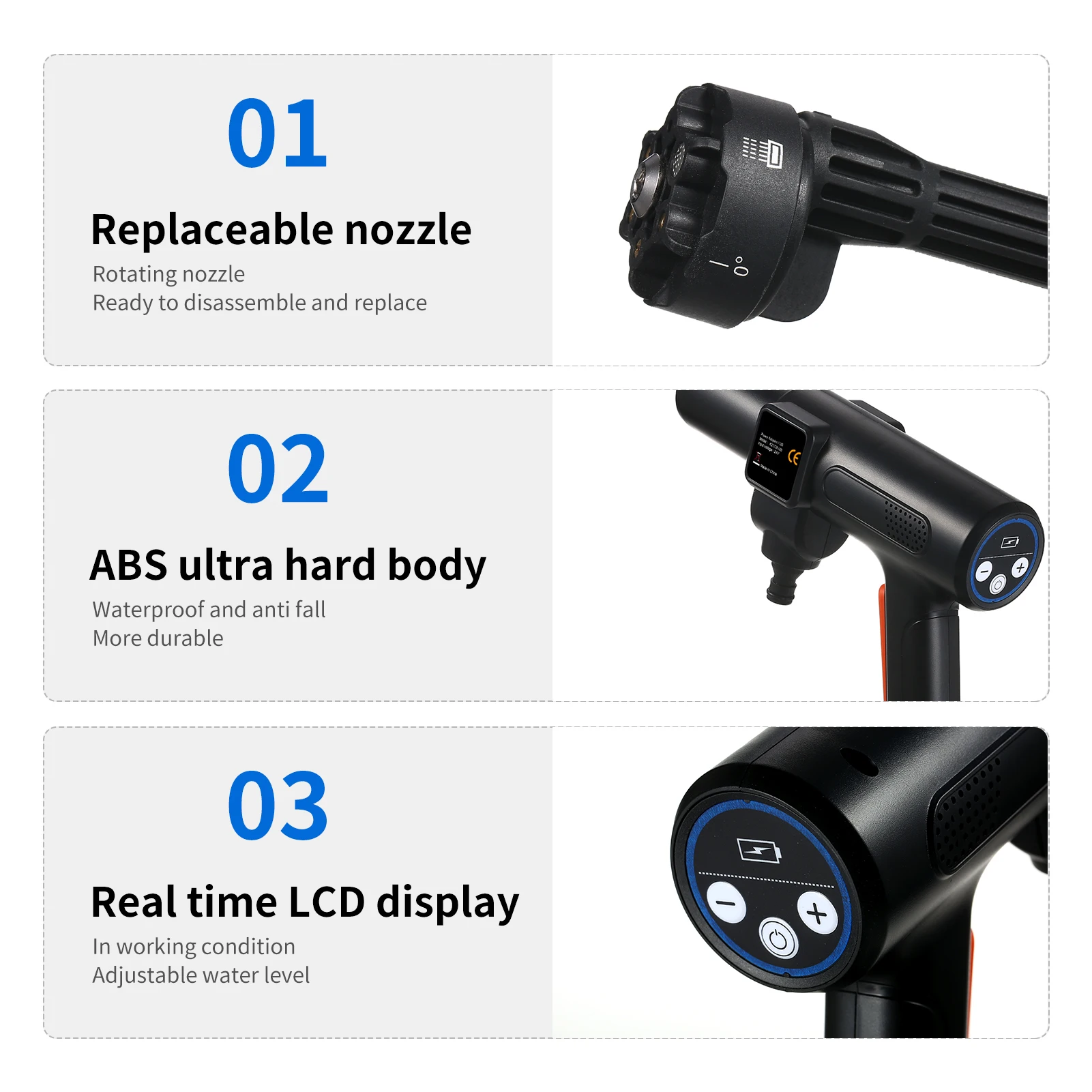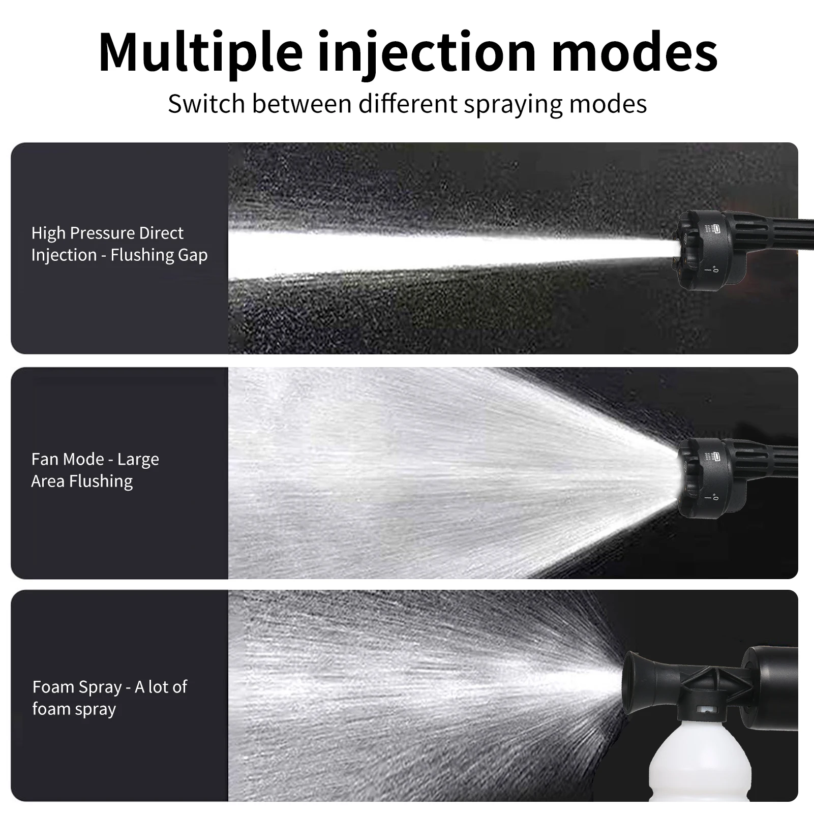 Multiple Spraying Modes: Rotate the nozzle to disassemble and replace it. High pressure direct injection is suitable for cleaning gaps, sector mode is suitable for large area cleaning, and foam spraying is suitable for large amount of foam spraying.