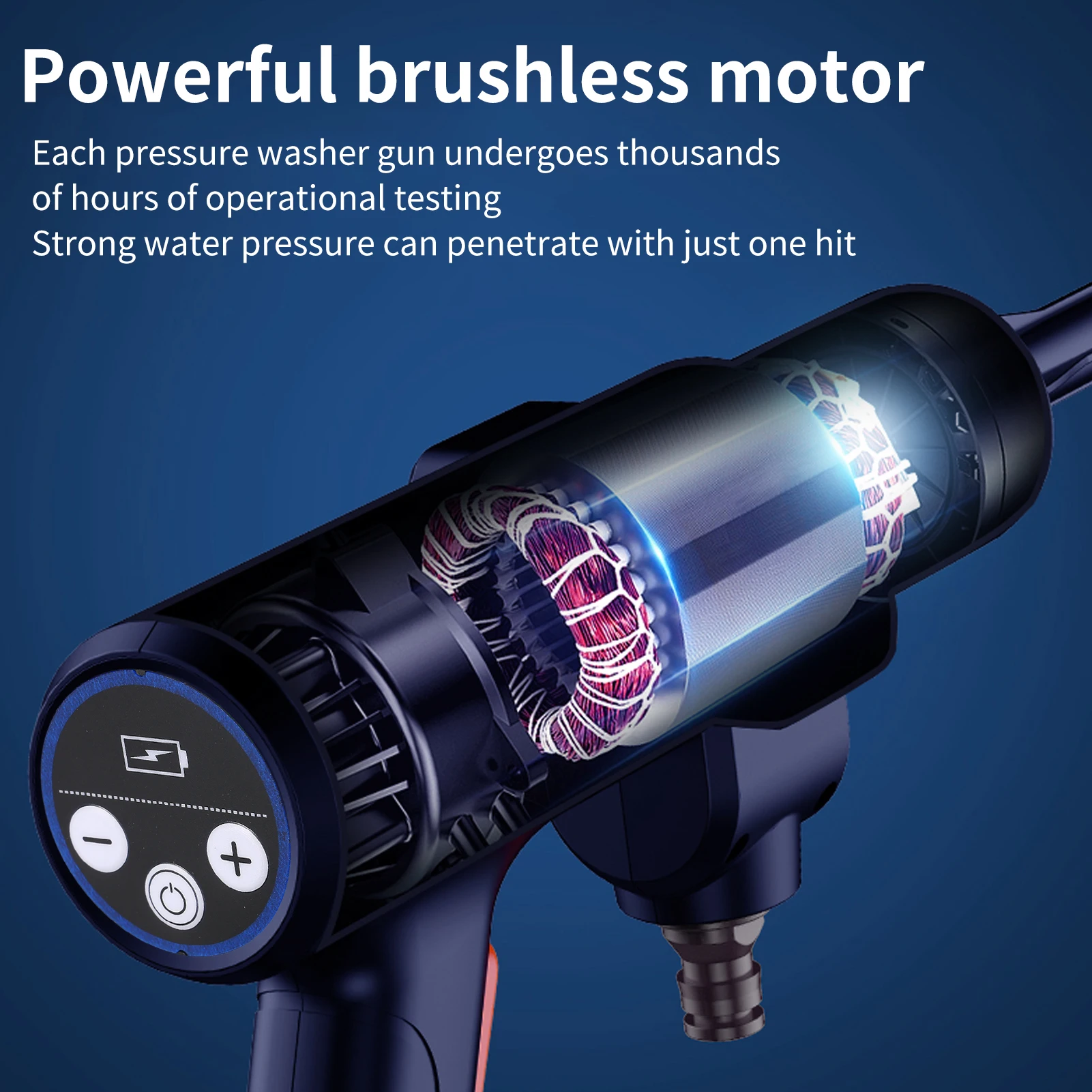 Powerful Pressure Washer: Super high power and is easy to use. The motor is a powerful 3820 brushless motor, which effectively removes dirt. 24V strong voltage, secondary amplification of water flow, range up to 6-12 meters. Each machine has undergone thousands of hours of operation testing, allowing you to easily and quickly clean your car and all outdoor areas that need to be cleaned.