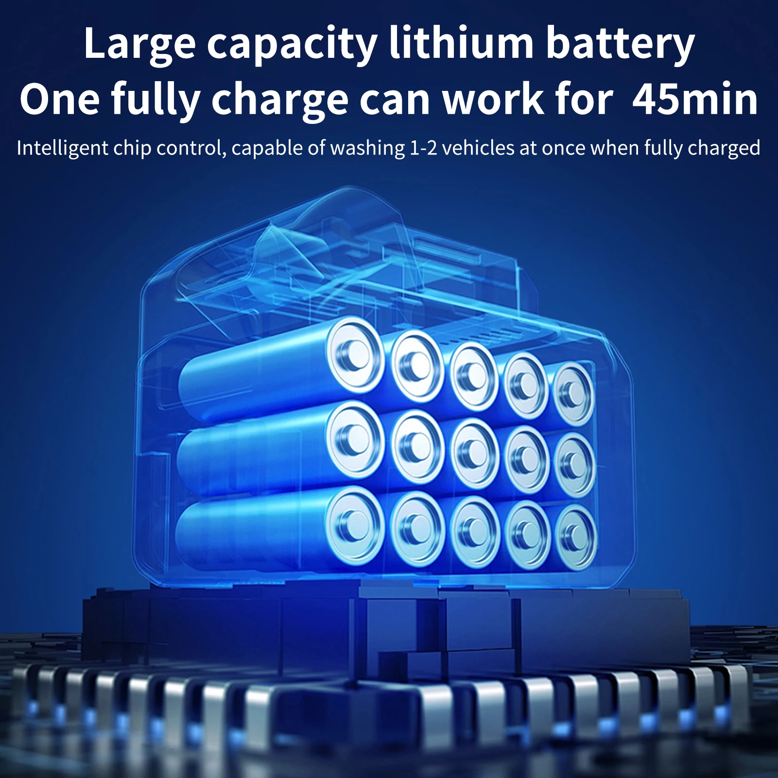 Large Capacity Battery: Built in 1500 * 10mAh lithium battery, the using time of pressure washer for up to 45min with once charge, intelligent chip control, fully charged, can wash 1-2 cars at once. It can help you complete more cleaning in a shorter time.