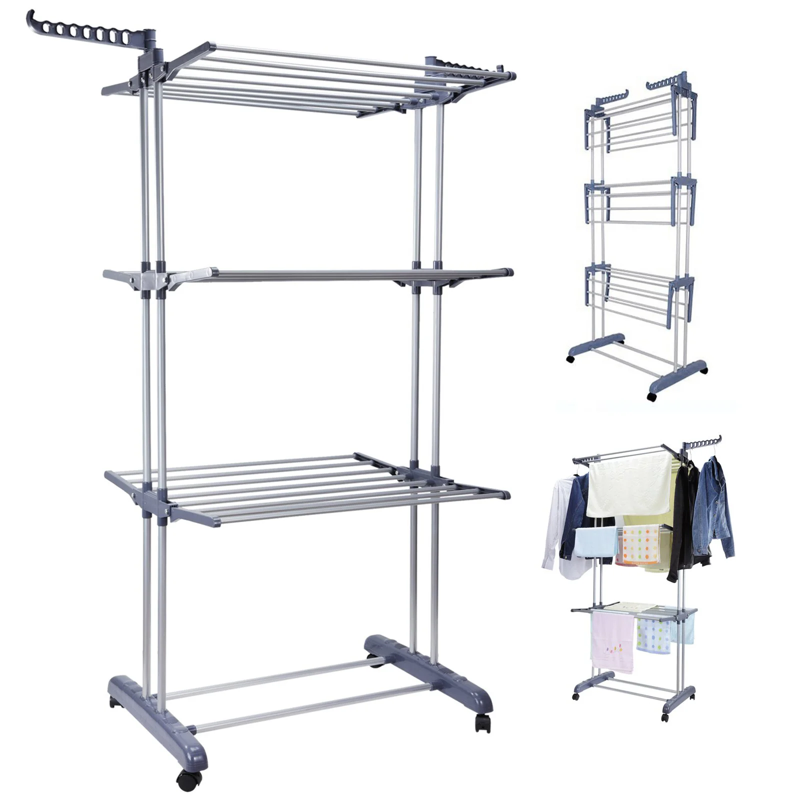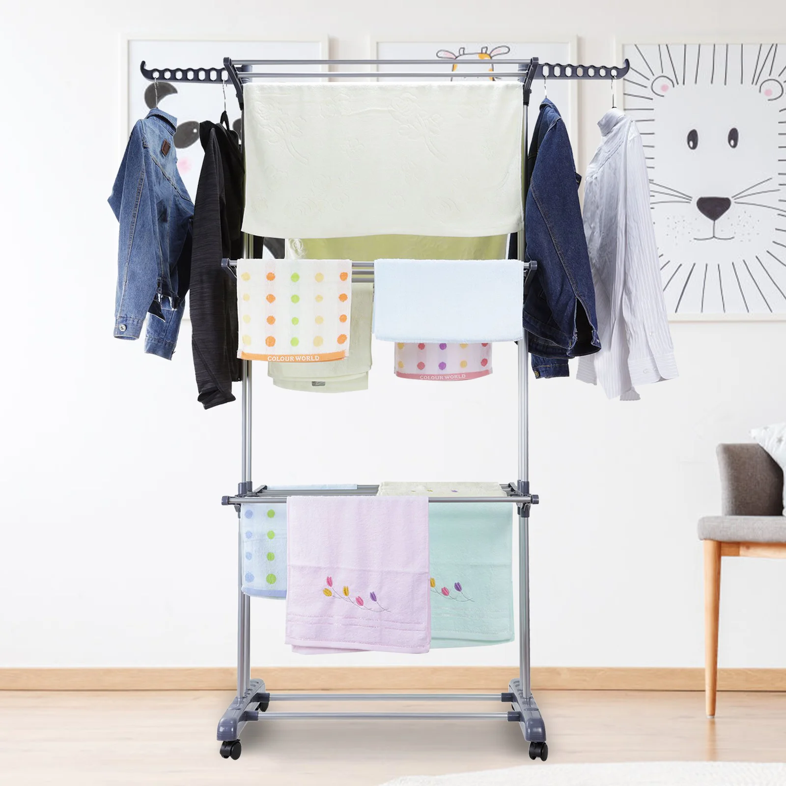 This practical and fashionable coat rack is a great multi purpose combination of coat hanger/airer and towel hanging rail. It features with large drying area and you can lay garments flat to help it dry in the sun quickly. Equipped with 4 movable pulleys, it is convenient to move the rack, which can be placed indoors and outdoors. Made of high-quality material, it is strong in bearing capacity, stable and durable. This item is also easy to use and simple to install.