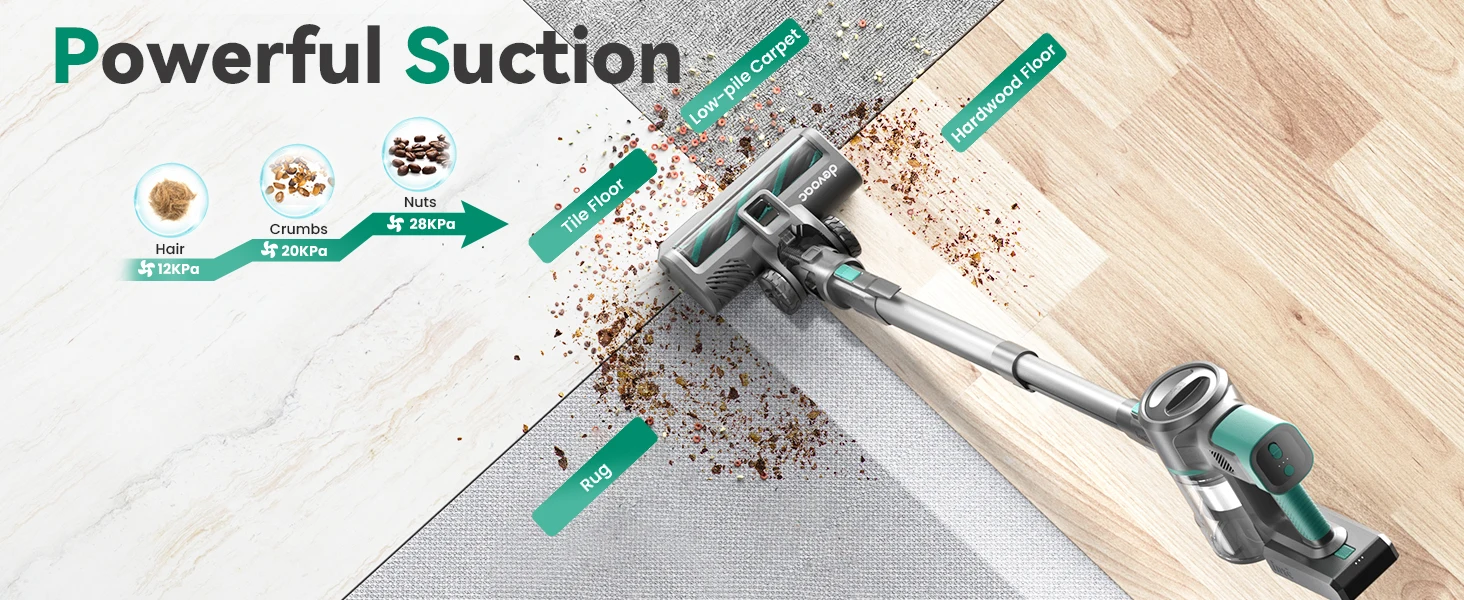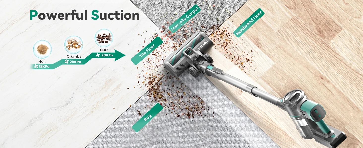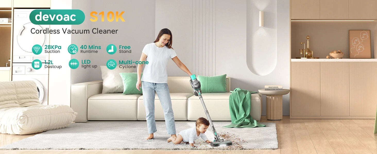 The DEVOAC S10K Cordless Vacuum Cleaner delivers powerful 28Kpa suction with three versatile modes, making it ideal for carpets, pet hair, and hard floors. Its lightweight handheld and stick design ensures easy maneuverability and efficient cleaning in every corner of your home. Perfect for tackling various surfaces, this vacuum combines convenience with expert-level performance.