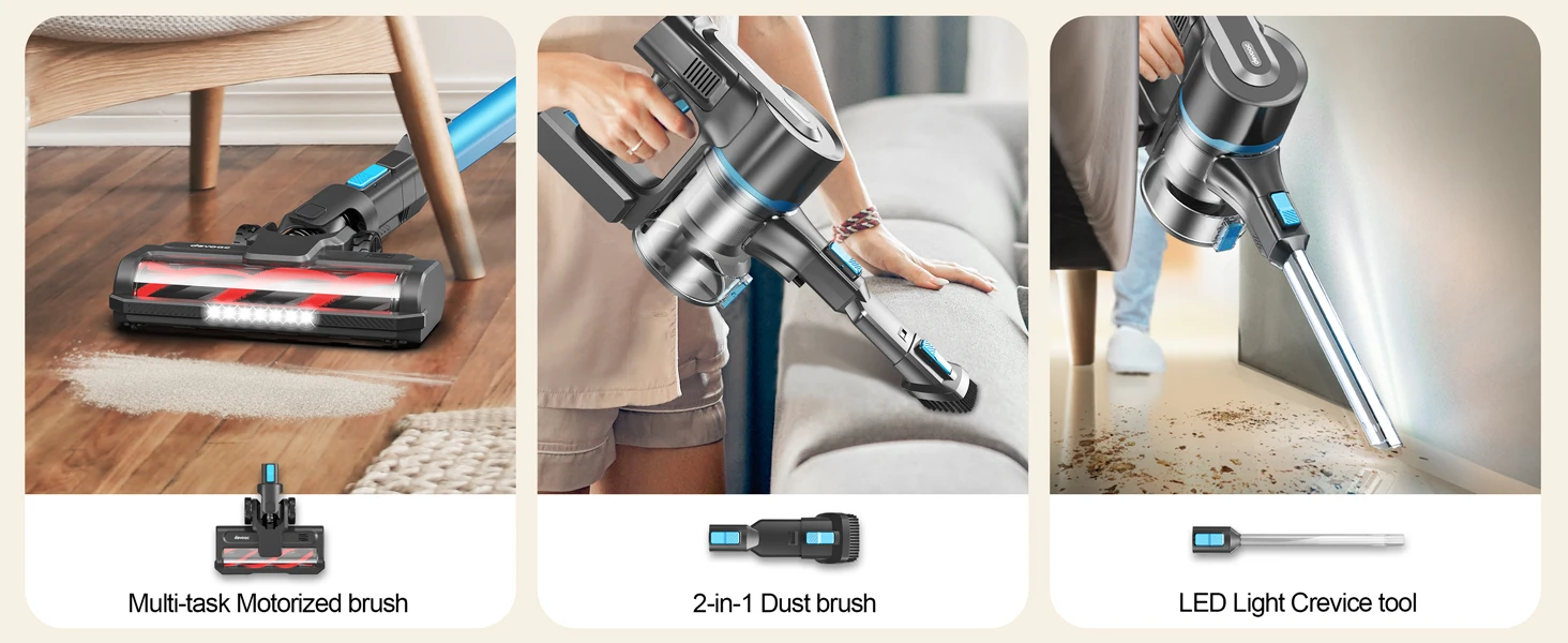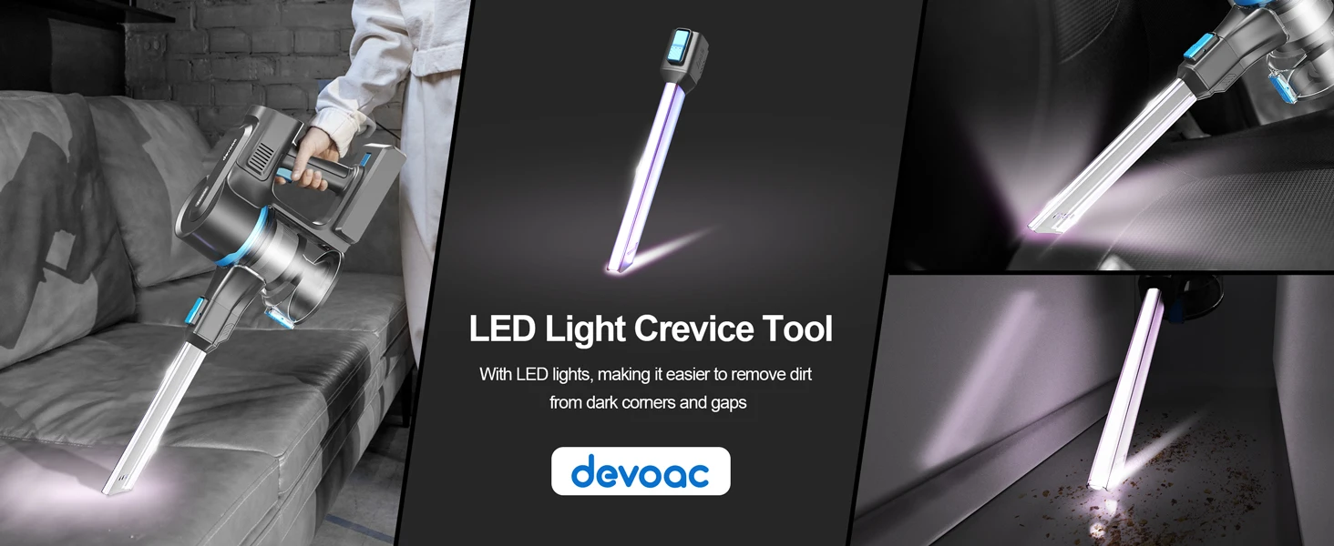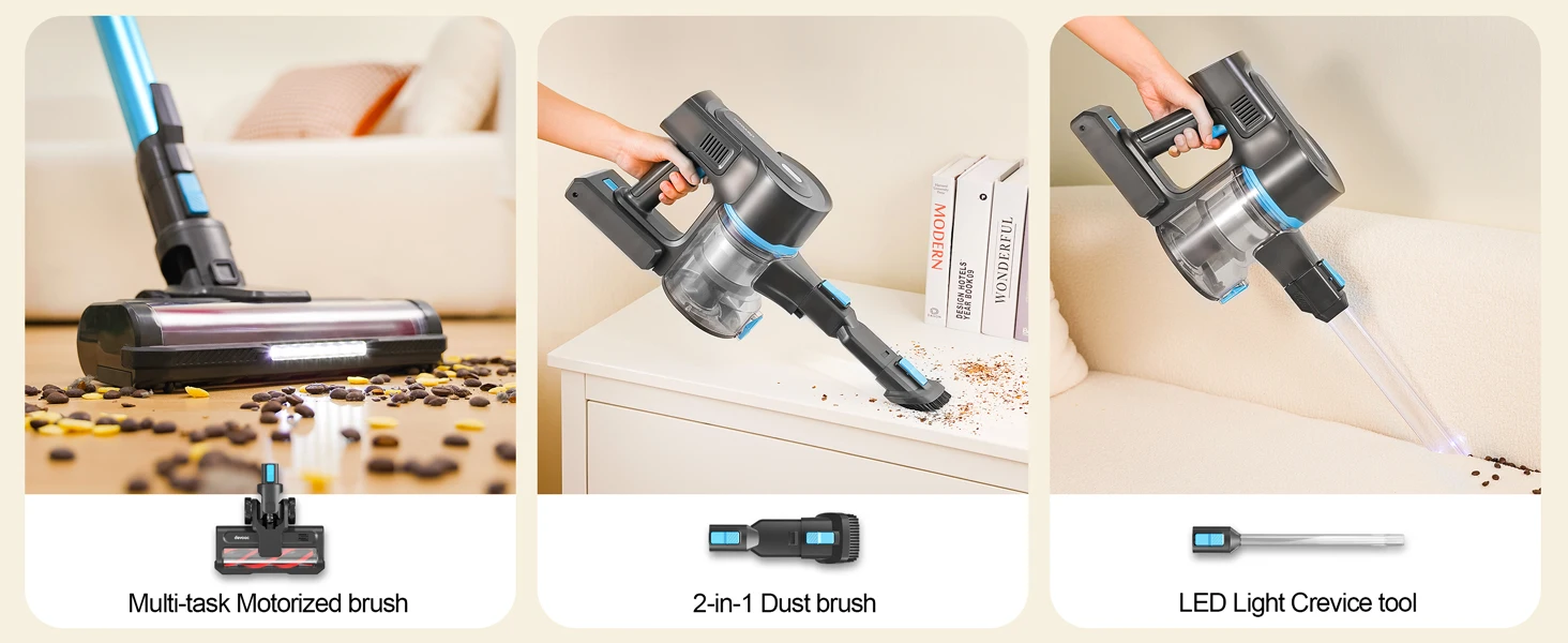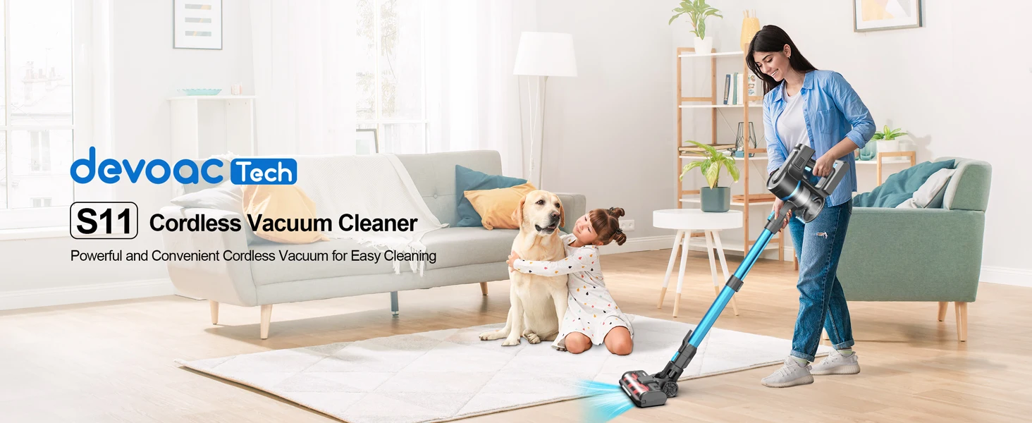 The DEVOAC S11 Cordless Vacuum Cleaner features a robust 350W brushless motor generating 30Kpa suction power, effectively capturing dirt, dust, and stubborn pet hair from various surfaces. Its lightweight stick design enhances portability and ease of use, allowing for extended cleaning sessions without strain. The cordless operation provides freedom of movement, making it ideal for quick cleanups and reaching difficult areas. Engineered for pet owners, this vacuum combines high-performance suction with practical design elements to deliver a thorough and efficient cleaning experience in any home environment.