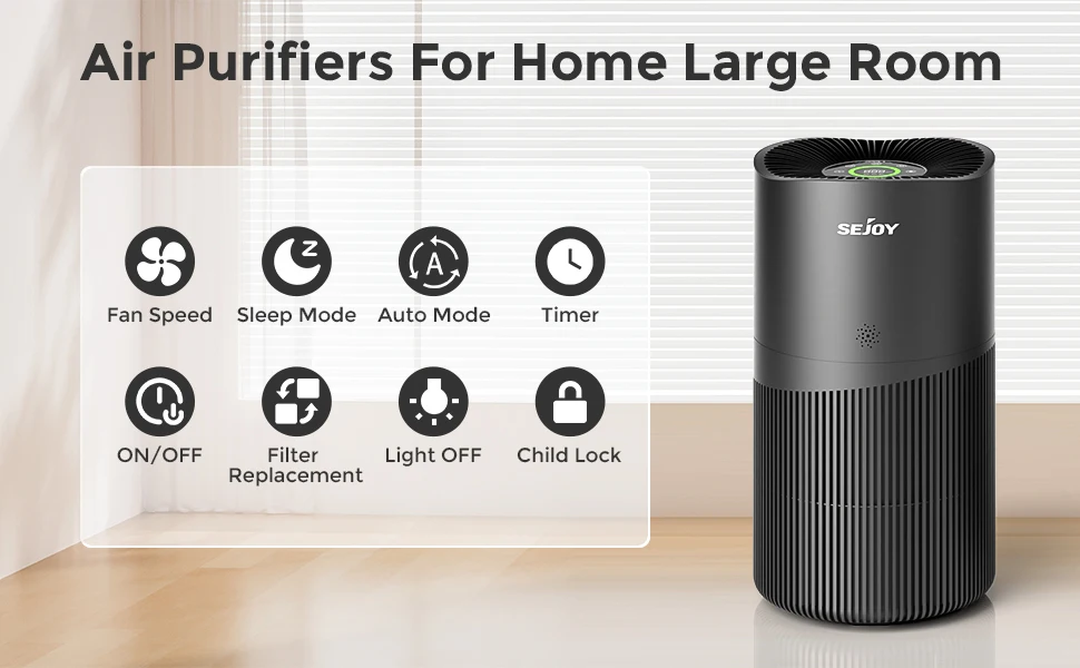 This HEPA air purifier is designed for large rooms, effectively removing smoke, pollen, pet dander, and dust to improve indoor air quality. Equipped with a high-efficiency HEPA filter, it captures fine particles, providing cleaner air for households. Ideal for allergy sufferers and those seeking a healthier living environment, this purifier ensures efficient and reliable air purification across spacious areas.