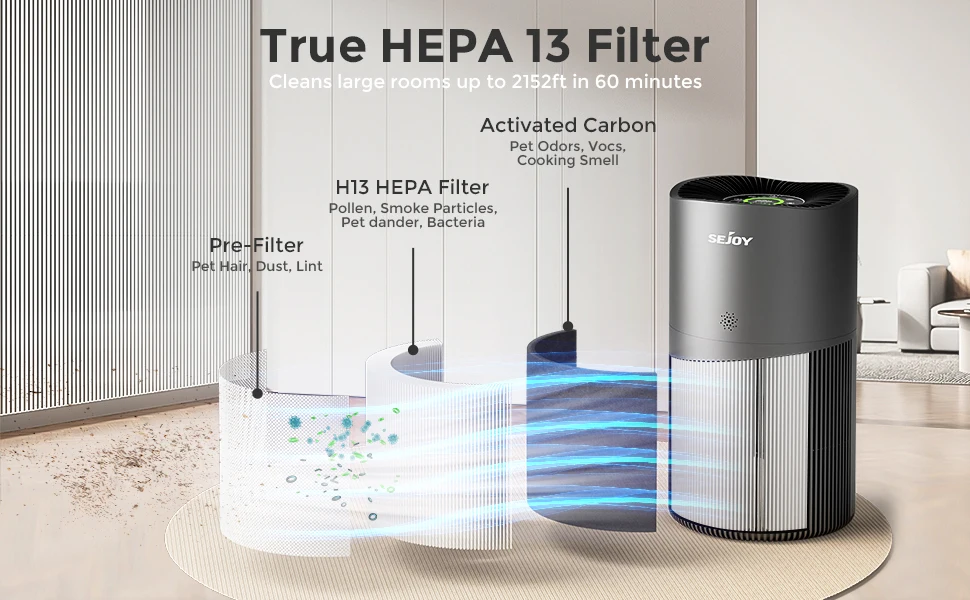 High Performance:Enjoy fresh air in minutes with the Air Purifier, which has a CADR of 264 CFM/ 450 m³/h and can purify the air of a 3120 ft² space once/hour (based on HEPA Original Filters; not applicable to other replacement filters).